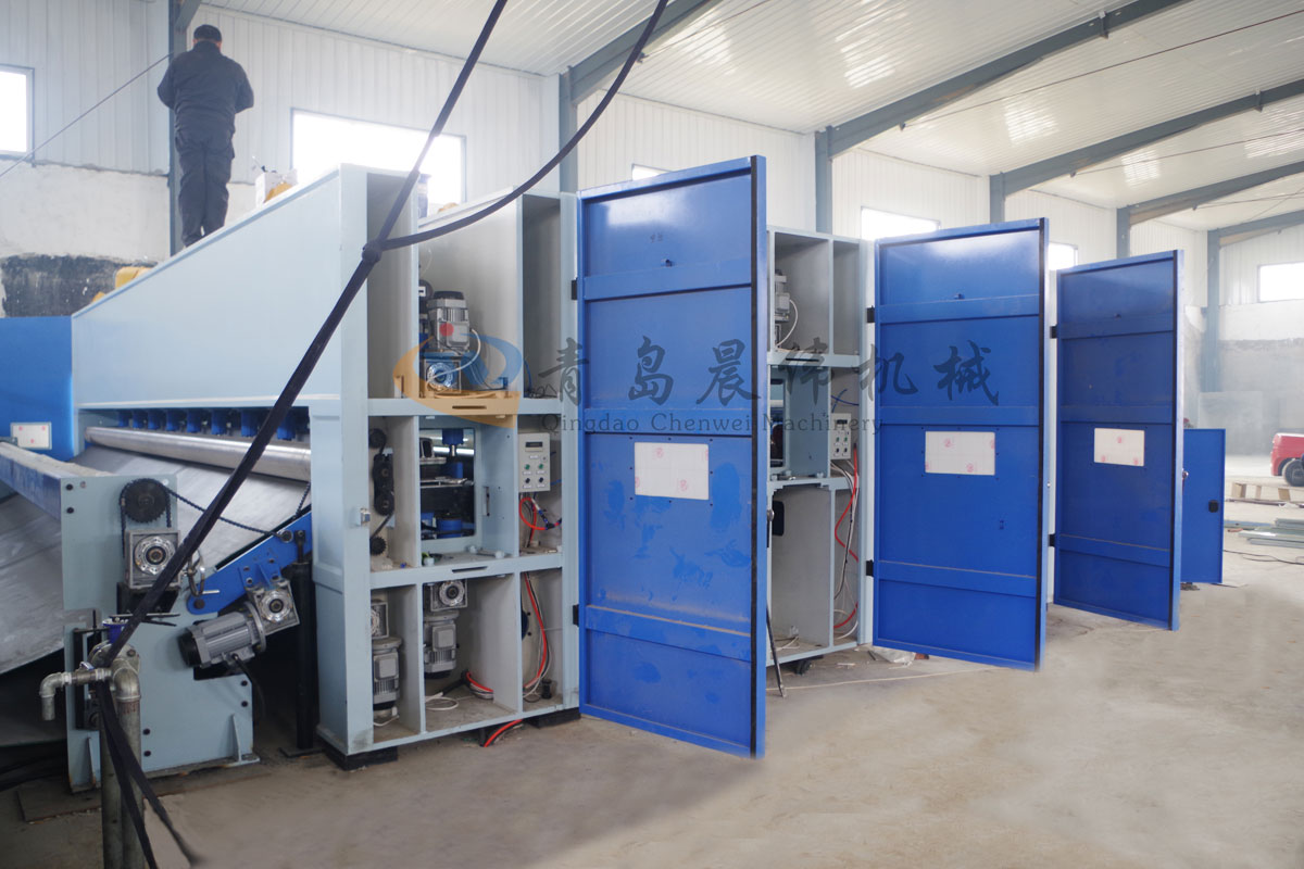 5. CWPW-鋪網(wǎng)機(jī):用于將梳理纖網(wǎng)通過移動小車交叉折疊為所需幅寬和定量的多層纖網(wǎng),以供后道工序使用。鋪網(wǎng)輥采用特殊結(jié)構(gòu),加裝壓網(wǎng)輥和導(dǎo)流板,不飄網(wǎng)不起皺,五只大功率電機(jī)精確控制各部件的運動,電動輸出簾高度調(diào)節(jié)裝置